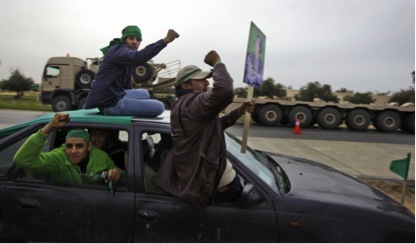 Occasionally we would hear some commotion from the crowd up ahead and it would be difficult to know if what we were hearing was cheering or something more negative. It sounded like the kind of noise that might accompany a crowd circled around a fight or the overturning of a truck; we were unable to tell from where we were standing. We could begin to see, however, some trucks slowly emerging, stacked with people waving green flags and punching their fists into the air. One truck carried a tall picture of Gaddafi and it was clear that even among all this chaos we were witnessing pro-regime demonstrations. Fireworks burst into the sky, some into the crowd. Alongside cheering were pro-Gaddafi chants. For me, one of the most tragic moments was hearing a small little girl; maybe five years old, singing along to the chants, blissfully ignorant of the bloodshed that was being spilt across Libya. The demonstrations made no sense; the thousands there were fleeing because of Gaddafi and yet many from among the crowd were cheering in support of this propagandist farce.